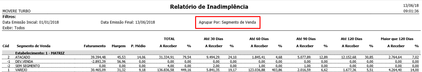 O relatório [R1117-inadimplência] possibilita a exibição pelos seguintes agrupamentos: