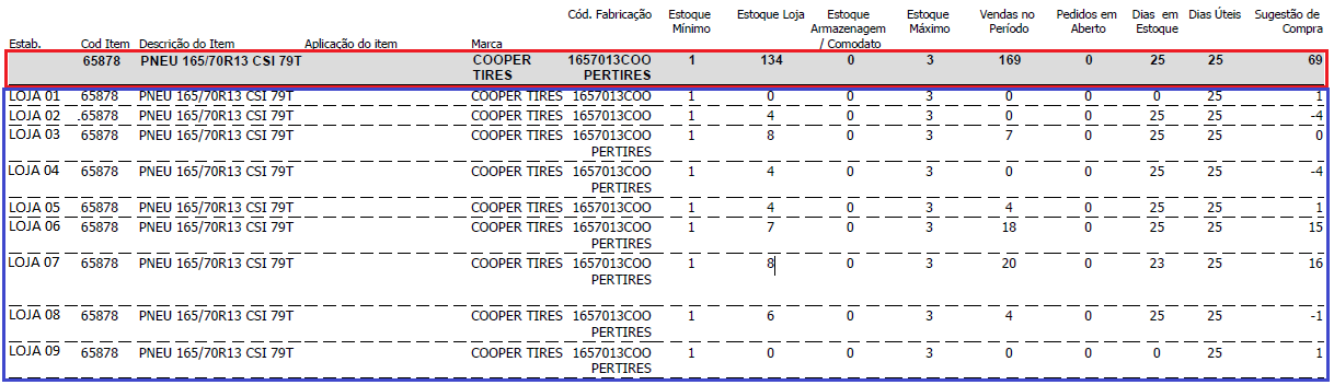 No exemplo acima, no quadrado vermelho de fundo cinza, é o agrupamento, onde é exibido os dados agrupados composto pelos valores e quantidades de todas as lojas listadas abaixo. No quadrado azul, de fundo branco, é os dados do item para cada loja.
