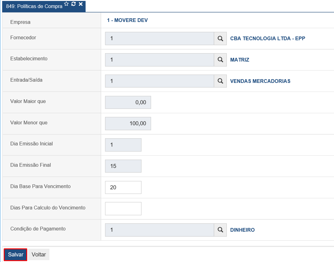 Essas políticas serão usadas para definir a Condição de Pagamento, o Dia do Vencimento e o Mês de vencimento a ser utiliza pelo item na [R139 - Notas Fiscais de Entrada] e na [R464 - Pedido de Compras].