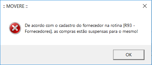 Dessa forma ao tentar fazer o lançamento do pedido de compra na rotina [R464 - Pedidos de Compras] ou a nota fiscal de entrada na rotina [R139 - Notas Fiscais de Entrada] o sistema não irá deixar prosseguir ao clicar em próximo, alertando o usuário que as compras estão suspensas para aquele fornecedor: