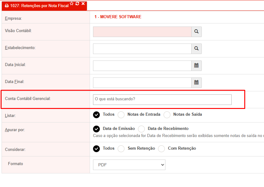 A partir da versão v4.670 do MOVERE, a rotina [R1027 – Retenções por Nota Fiscal] passa a permitir o filtro por contas contábeis gerenciais, com base nos lançamentos contábeis vinculados à transação da nota fiscal.
