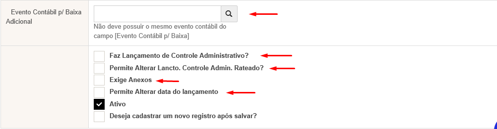 Evento Contábil p/ Baixa Adicional: Utilizado para informar um Evento Contábil adicional ao Evento Contábil já informado no campo acima.