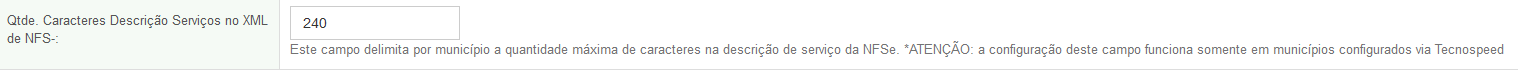 Para solucionar essa situação, foi criado na rotina 53[Cidades] o campo "Qtde. Caracteres Descrição Serviços no XML de NFS- " que permite o cliente configurar a quantidade máxima de caracteres aceitos no campo descrição da NFSe para tal município. Mas atenção, essa configuração funciona APENAS para municípios homologados pela TecnoSpeed.