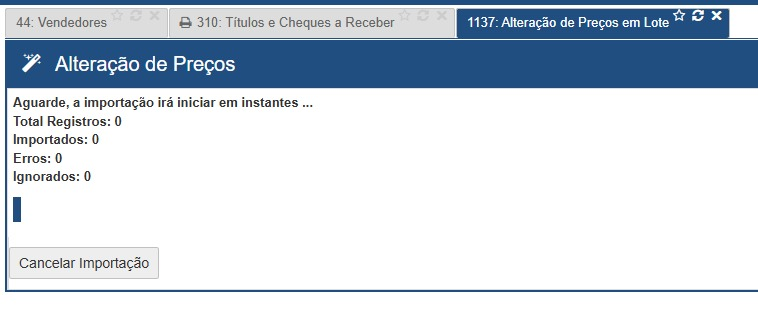 Em alguns contextos, a depender de diversos fatores, a importação de dados pode não iniciar e a tela fica parecida com isso aqui: