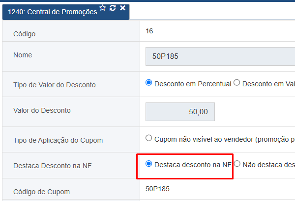 Aplicação na R11. Como o cupom [10P175] não destaca o desconto na NF, o desconto é aplicado diretamente sobre o valor unitário do item, já o cupom [50P185], que destaca o desconto, aplica o percentual de desconto no campo [%Desc. Unitário]: