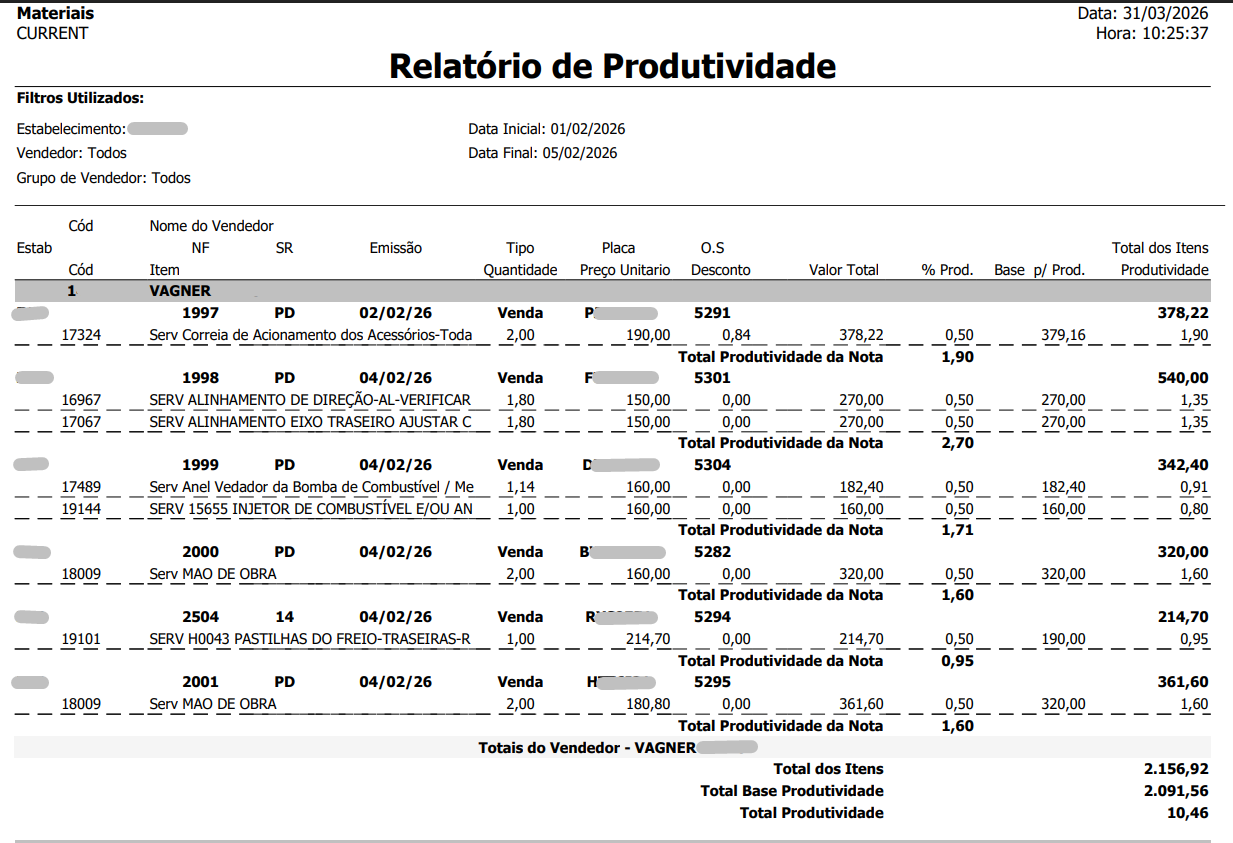 O relatório de produtividade tem como objetivo calcular e exibir a performance de vendas e devoluções de vendedores, mecânicos e supervisores/gerentes, considerando a configuração de comissões e o valor líquido das transações (sem acréscimos e já descontados os abatimentos).